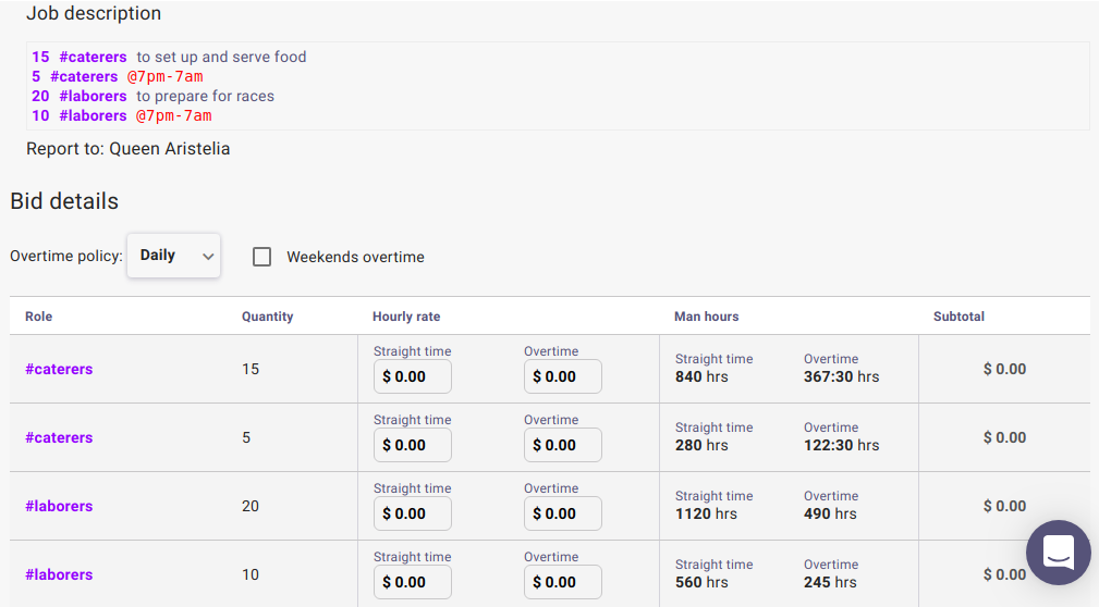 The bid had been accepted! Snow White set about entering her employees’ names and pay rates into the system via magical import. Then she assigned 50 workers to day and night shifts.